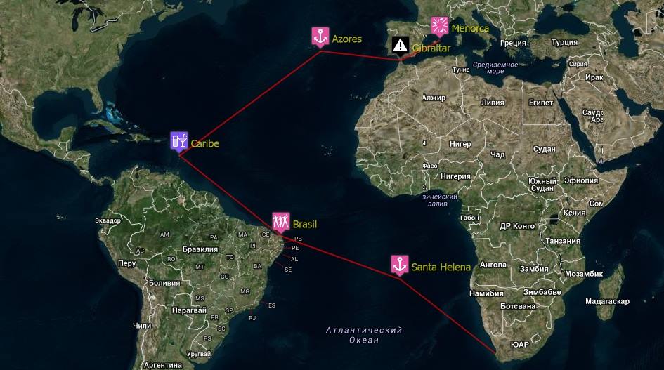 Inicialmente teníamos planeado una subida del Atlántico parando en Santa Helena, Ascensión, Cabo Verde, Canarias y finalmente Mediterráneo. Tras consultarlo con otros navegantes y demás fuentes, hemos decidido, por “razones técnicas”, seguir la ruta de los vientos alisios que nos llevaran hasta Brasil, el Caribe, las Azores y Estrecho de Gibraltar.